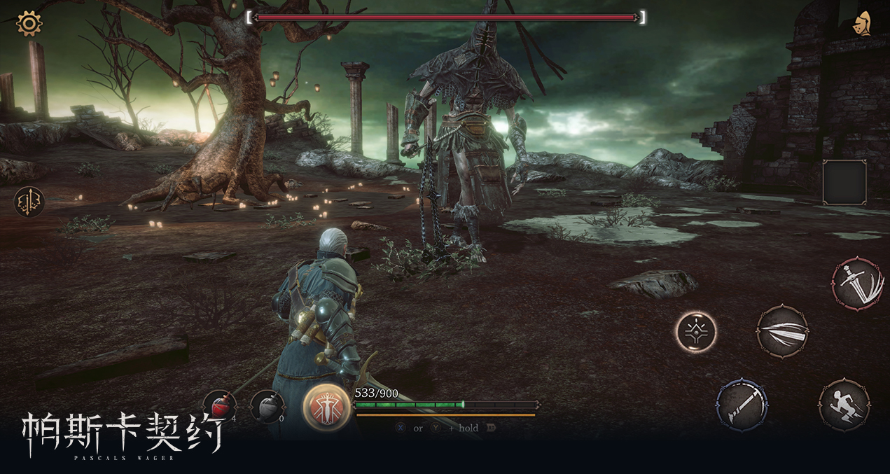 至于《帕斯卡契约》的ACT战斗部分,是采用现在3D动作游戏惯常的设计:锁定敌人后可圆周或径向移动,招式动作消耗耐力。在这类游戏中,耐力消耗量、招式的判定距离和硬直是战斗策略的核心要素。《帕斯卡契约》的「打击感」做得相当扎实,判定很稳,在触屏上的体验不赖。其战斗强度也不低,试玩版中怪物的血量一般需要玩家完成2套以上的连段攻击,甚至跟多。